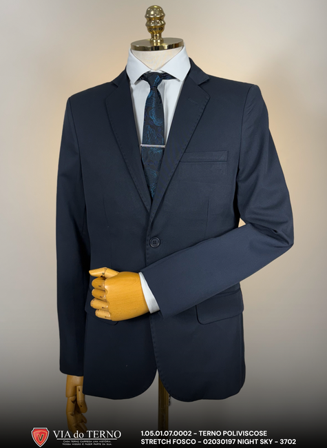 A cor Night Sky é um azul noturno profundo e misterioso. Com seu acabamento fosco, ela se torna uma alternativa incrivelmente sofisticada e moderna ao tradicional terno preto, sendo a aposta certeira para casamentos noturnos, formaturas e grandes eventos sociais. A modelagem Slim Comfort entrega um corte levemente acinturado, proporcionando um visual contemporâneo que valoriza o porte físico sem abrir mão do bem-estar.