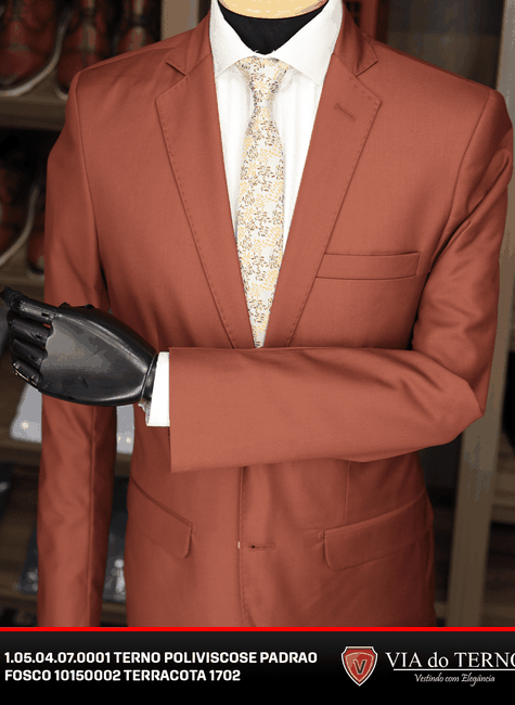 A tonalidade Terracota Fosco traz sofisticação com um toque contemporâneo, ideal para quem busca fugir dos tradicionais tons de preto e azul, mas ainda assim transmitir requinte. Um terno versátil que se adapta a casamentos, formaturas, eventos sociais e ocasiões corporativas em que a originalidade é bem-vinda.