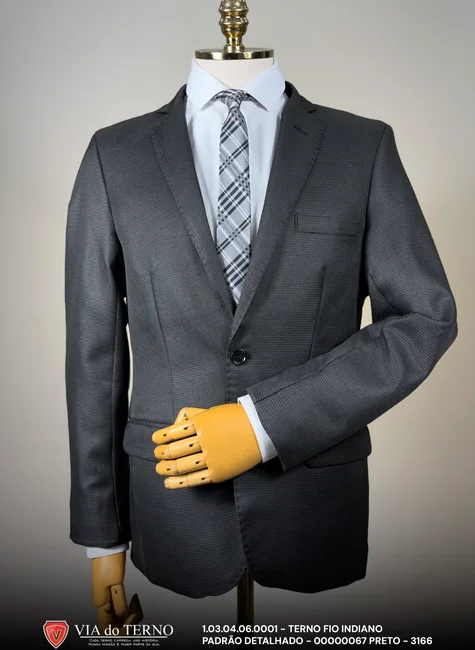 O Terno Slim Preto Detalhado da VIA do Terno é uma obra-prima de design e textura. Confeccionado em Fio Indiano, este traje destaca-se pelo seu padrão detalhado sutil, que confere uma riqueza visual única à peça, diferenciando-a dos ternos pretos lisos convencionais.