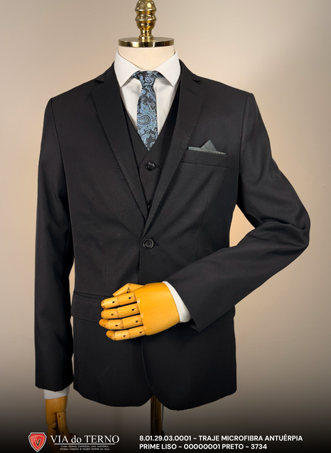 O Traje Completo Preto Liso da VIA do Terno é a peça fundamental e de maior prestígio no guarda-roupa de um homem. O preto é o clássico inquestionável, entregando autoridade máxima, sobriedade e elegância. O grande destaque deste conjunto é a presença do colete, o que o eleva ao status de traje completo (3 peças), sendo a opção mais segura e sofisticada para noivos clássicos, formandos e eventos de gala, garantindo que você permaneça impecável mesmo após retirar o paletó durante a festa.